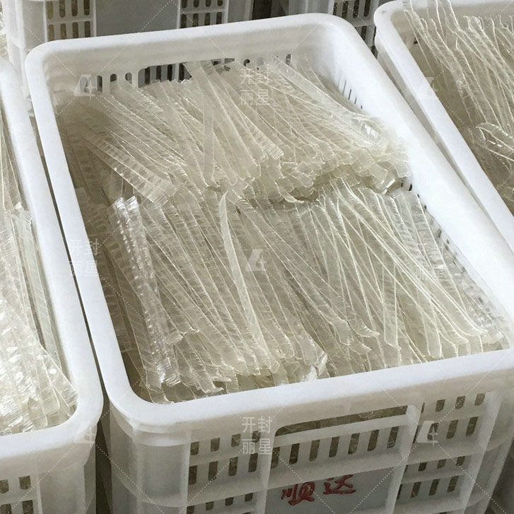 自動(dòng)化水晶粉皮生產(chǎn)線工藝流程:預(yù)熱→原料攪拌→真空上料→鋪漿成型→蒸箱蒸熟→水冷卻→脫離→烘箱烘干→橫切→二次烘干→排潮處理→成品出機(jī)。