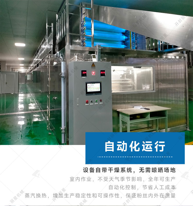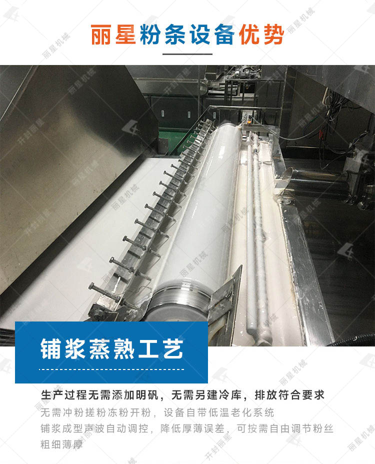 開封麗星生產(chǎn)的日產(chǎn)2-15噸粉條加工設(shè)備,采用鋪漿蒸熟無明礬工藝,自帶低溫老化系統(tǒng)無需開粉沖粉搓粉,自帶烘干系統(tǒng)無需晾曬場地,實現(xiàn)粉條加工封閉式自動化流水線運行。
